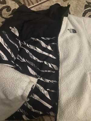 Зимняя куртка двухсторонняя . Основной цвет белый ,если вывернуть наизнанку и носить этой стороной , цвет черно белый .