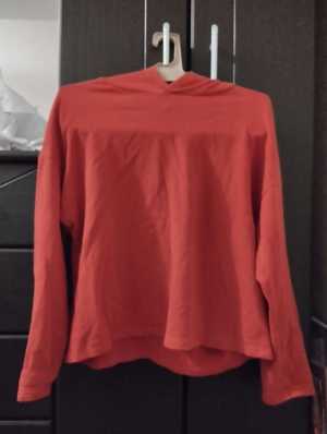 Женская красная толстовка с надписями на руках, но они почти стёрлись