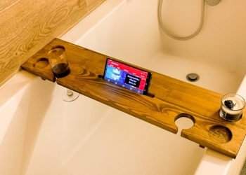 Столик для ванной комнаты, выполнен из мебельного щита, с обработкой маслом "Орех".