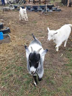 2 зааненские козы,сестры. 1год,2 месяца. Вторая помесь,двухцветная, 9 месяцев. Третья коза стельная,дойная,5 окот.