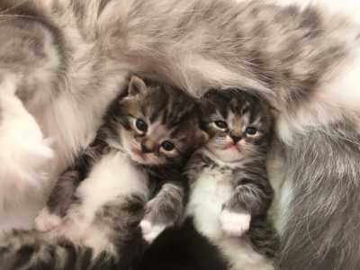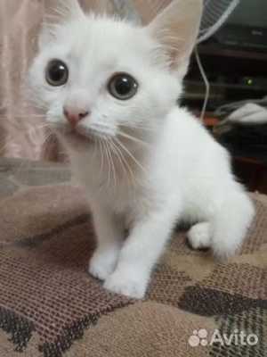 Котята белые, а хвостики серые и ушки обводка серая, один мальчик , две девочки у одной девочки серый носик.